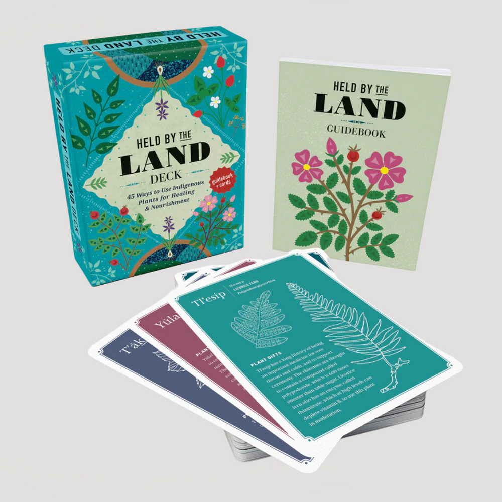 Plants can be a great source of healing as well as nourishment, and the practice of growing and harvesting from trees, flowering herbs, and other plants is a powerful way to become more connected to the land. The Indigenous Peoples of North America have long traditions of using native plants as medicine as well as for food. Held by the Land Deck includes 45 cards of indigenous plants and their properties and a 48-page booklet to guide you along the way. Here are some of the things you will find: