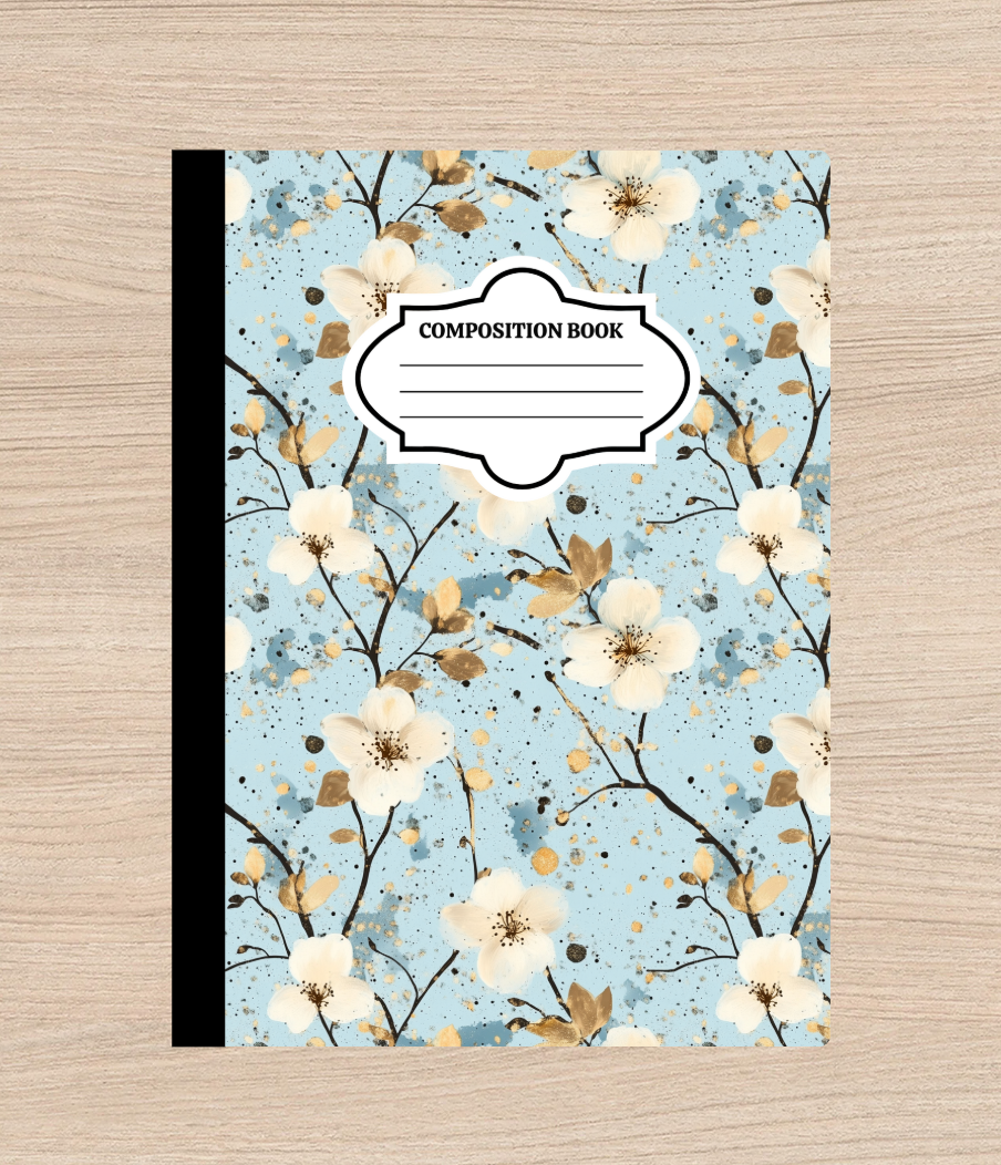 Bring a breath of fresh air to your desk with this stunning blue floral composition notebook, featuring delicate white blossoms, golden leaves, and subtle ink splatters over a dreamy sky-blue background. Thoughtfully designed for students, creatives, and paper lovers alike, this notebook combines classic function with elevated style.