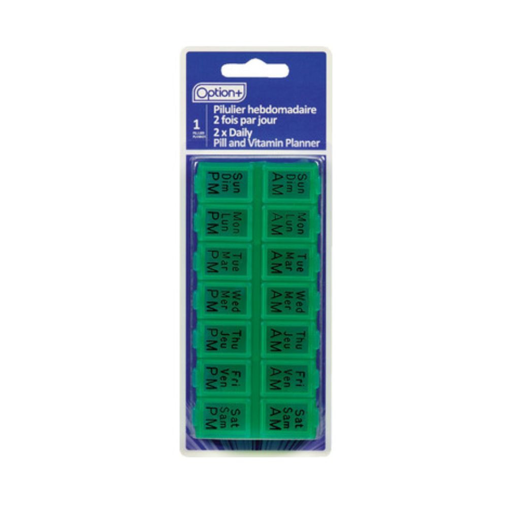 1 Daily pill planner with 14 compartments – two for each day of the week